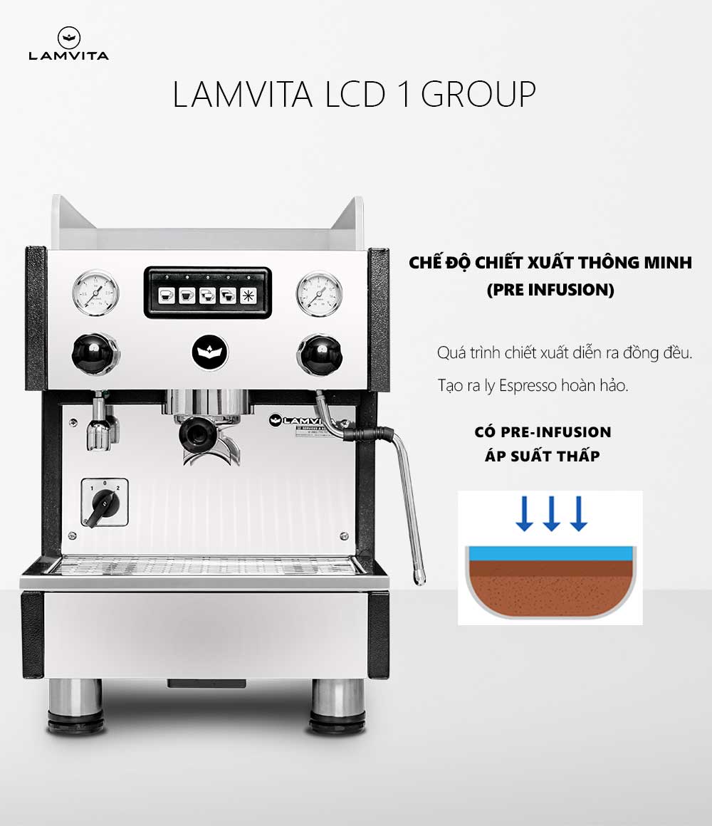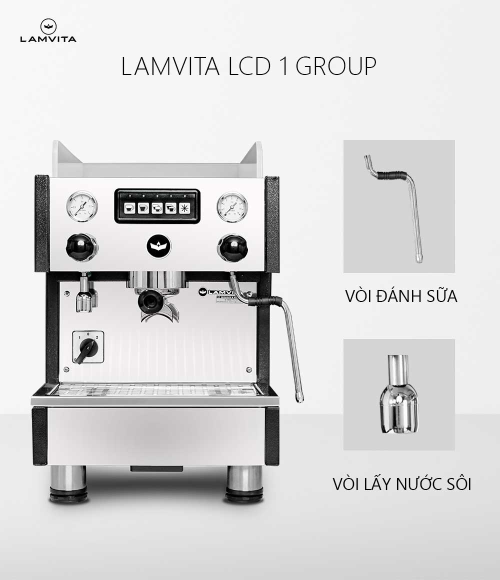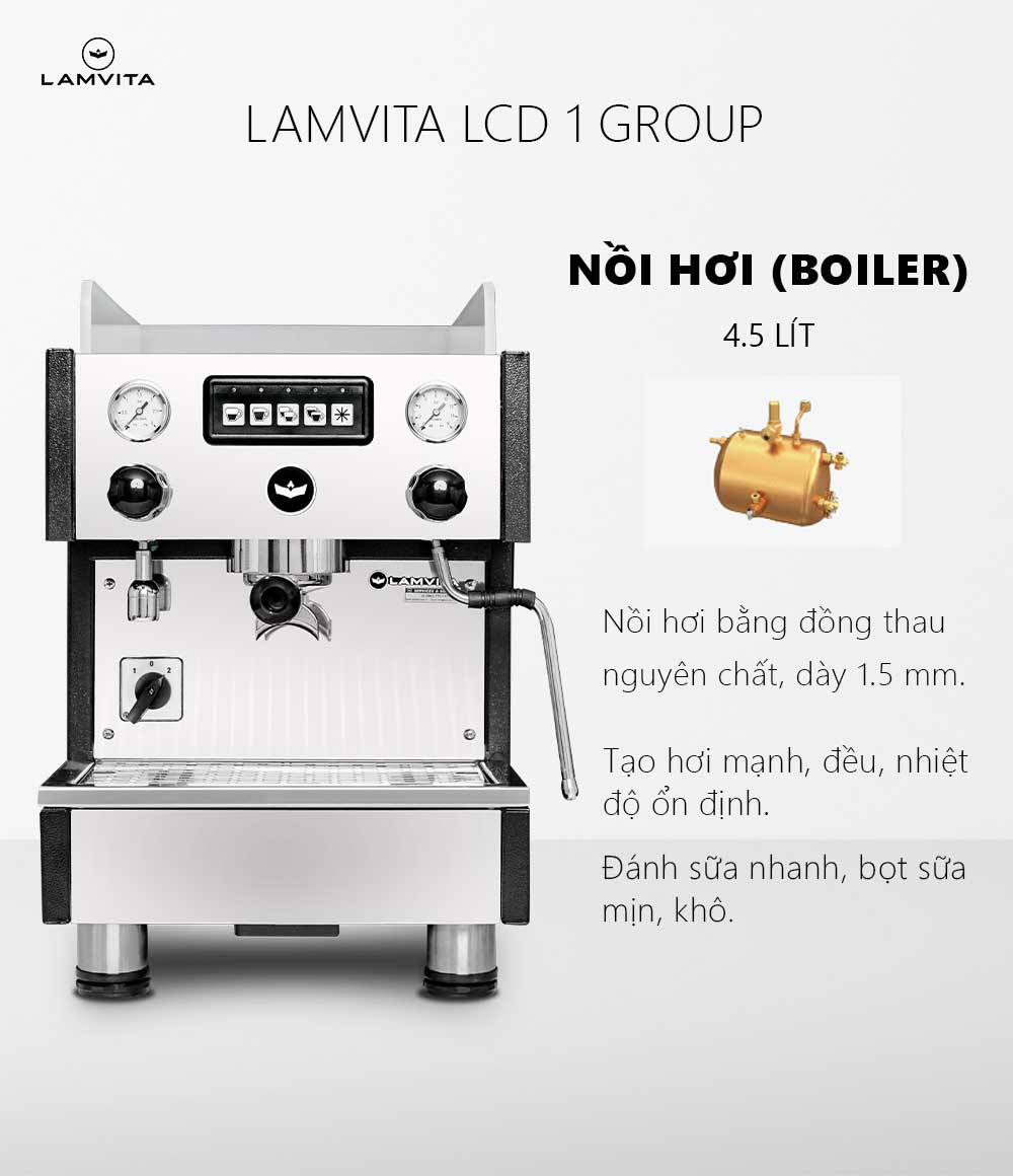 LAMVITA LCD 1 Group là dòng máy pha chuyên nghiệp, được trang bị nồi hơi (Boiler) lớn 4.5 lít cho áp suất hơi mạnh tạo bọt sữa mịn màng và khô. Bên trong nồi hơi lớn có bộ đun nước sôi (Heater) hình xoắn ốc giúp gia nhiệt nhanh tức thì và có thêm 1 nồi hơi con (Heat Exchanger) phục vụ việc pha cà phê. LAMVITA LCD 1 Group có nồi hơi lớn nên rất tiện lợi cho việc lấy nước sôi nhiều, pha trà hay pha cà phê phin.