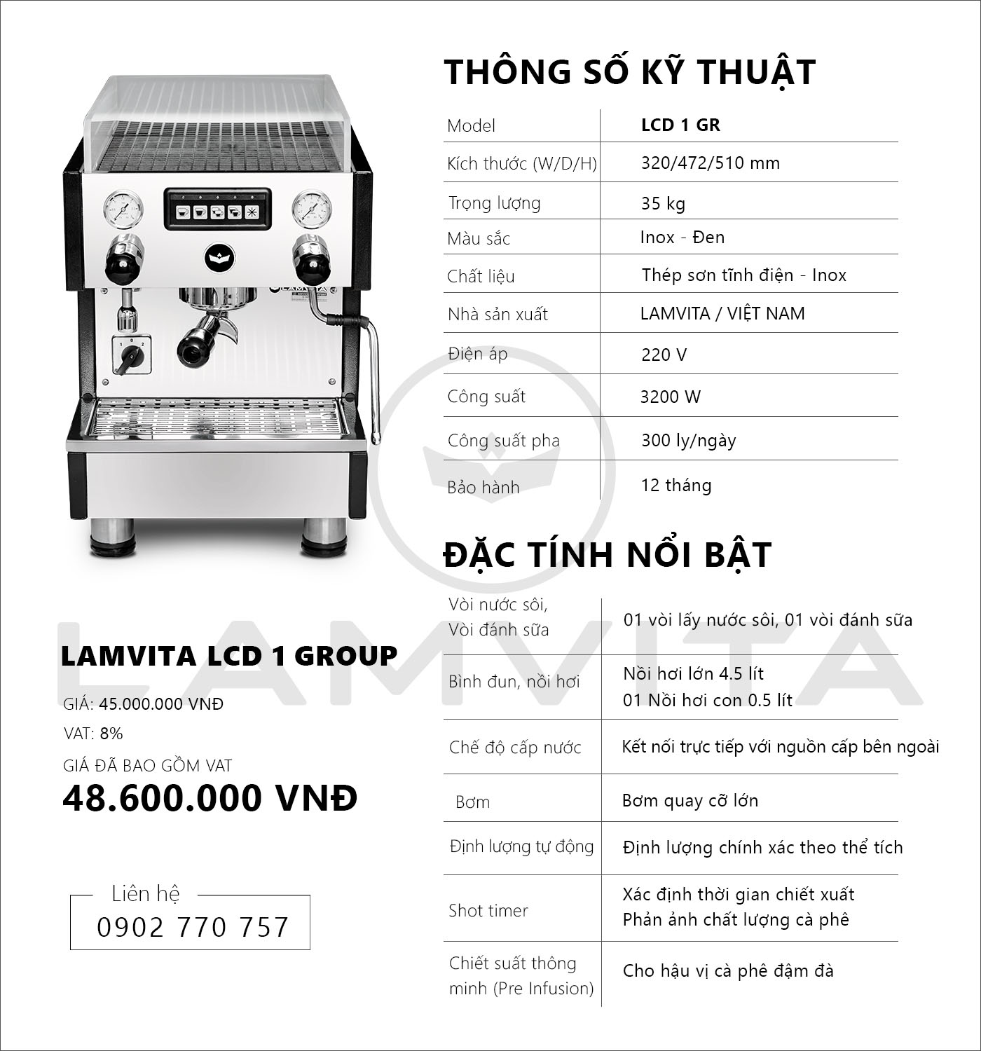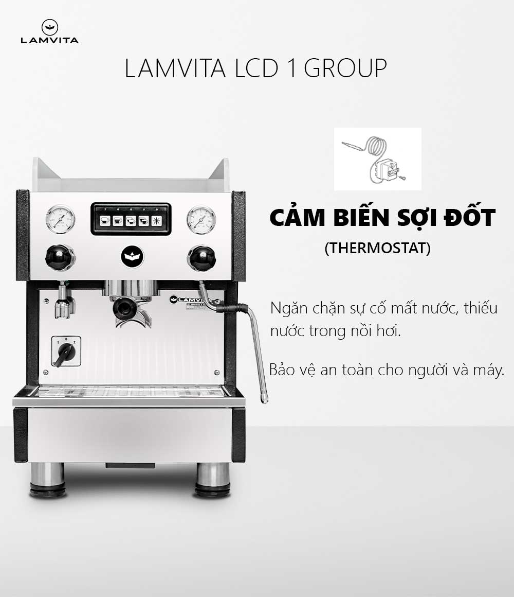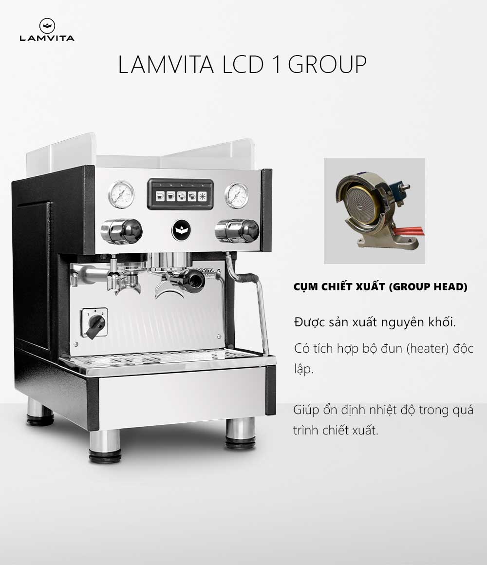 LAMVITA LCD 1 Group là dòng máy pha chuyên nghiệp, được trang bị nồi hơi (Boiler) lớn 4.5 lít cho áp suất hơi mạnh tạo bọt sữa mịn màng và khô. Bên trong nồi hơi lớn có bộ đun nước sôi (Heater) hình xoắn ốc giúp gia nhiệt nhanh tức thì và có thêm 1 nồi hơi con (Heat Exchanger) phục vụ việc pha cà phê. LAMVITA LCD 1 Group có nồi hơi lớn nên rất tiện lợi cho việc lấy nước sôi nhiều, pha trà hay pha cà phê phin.