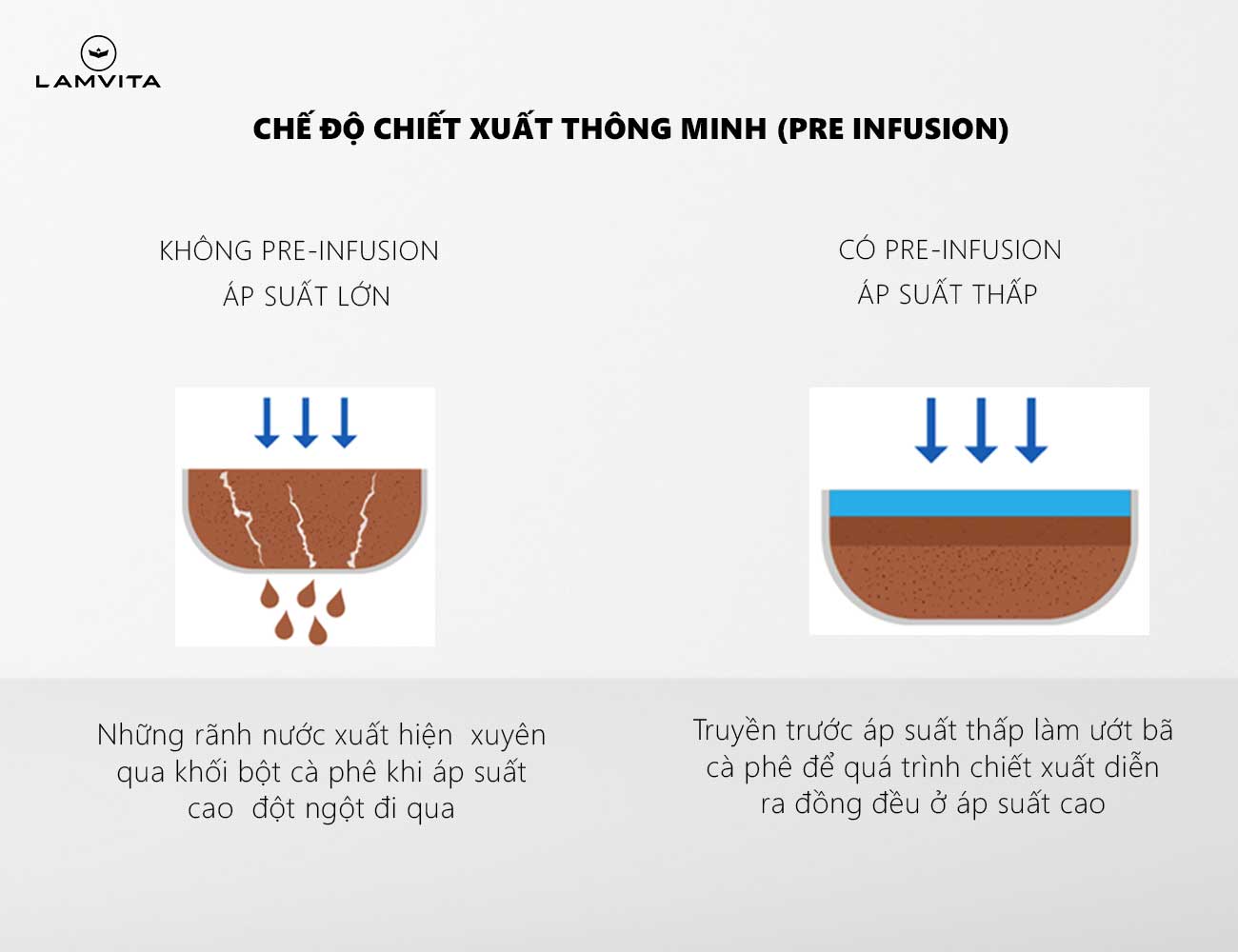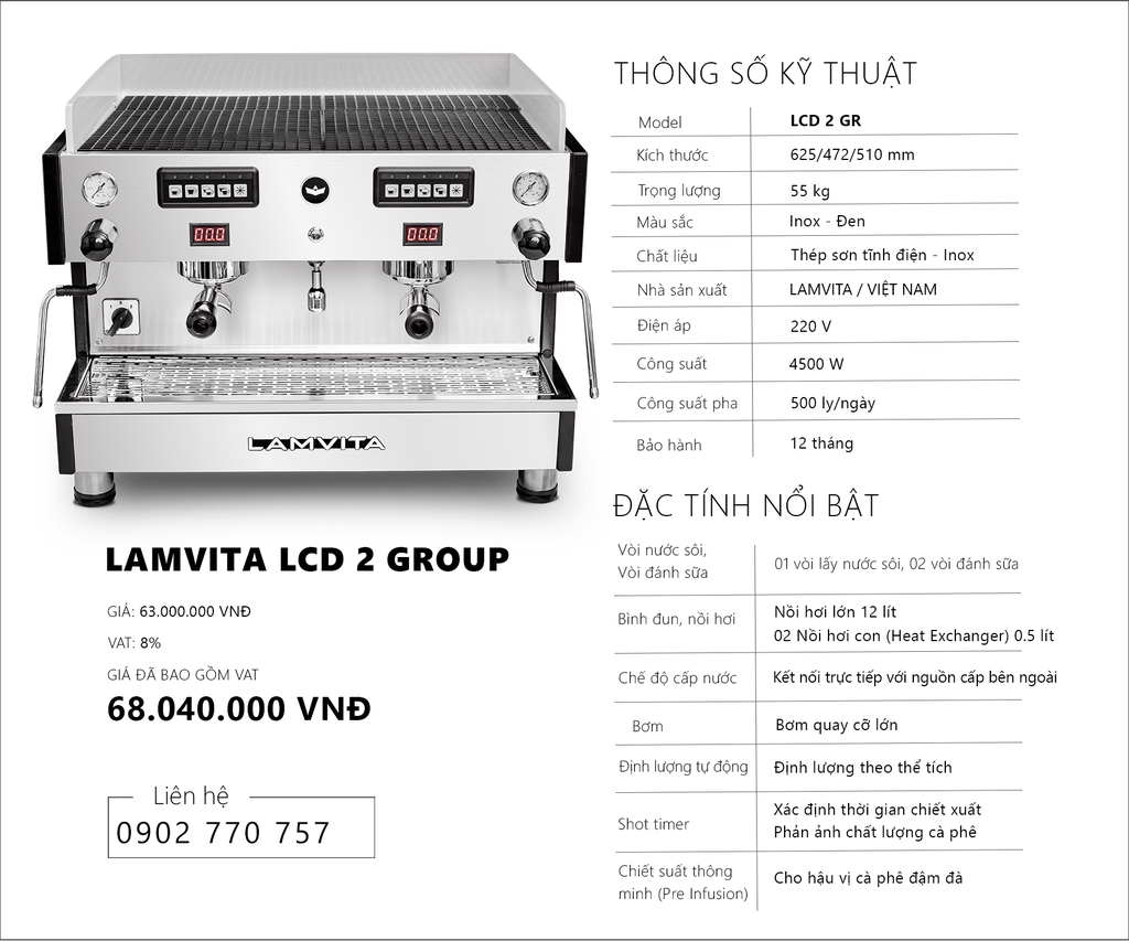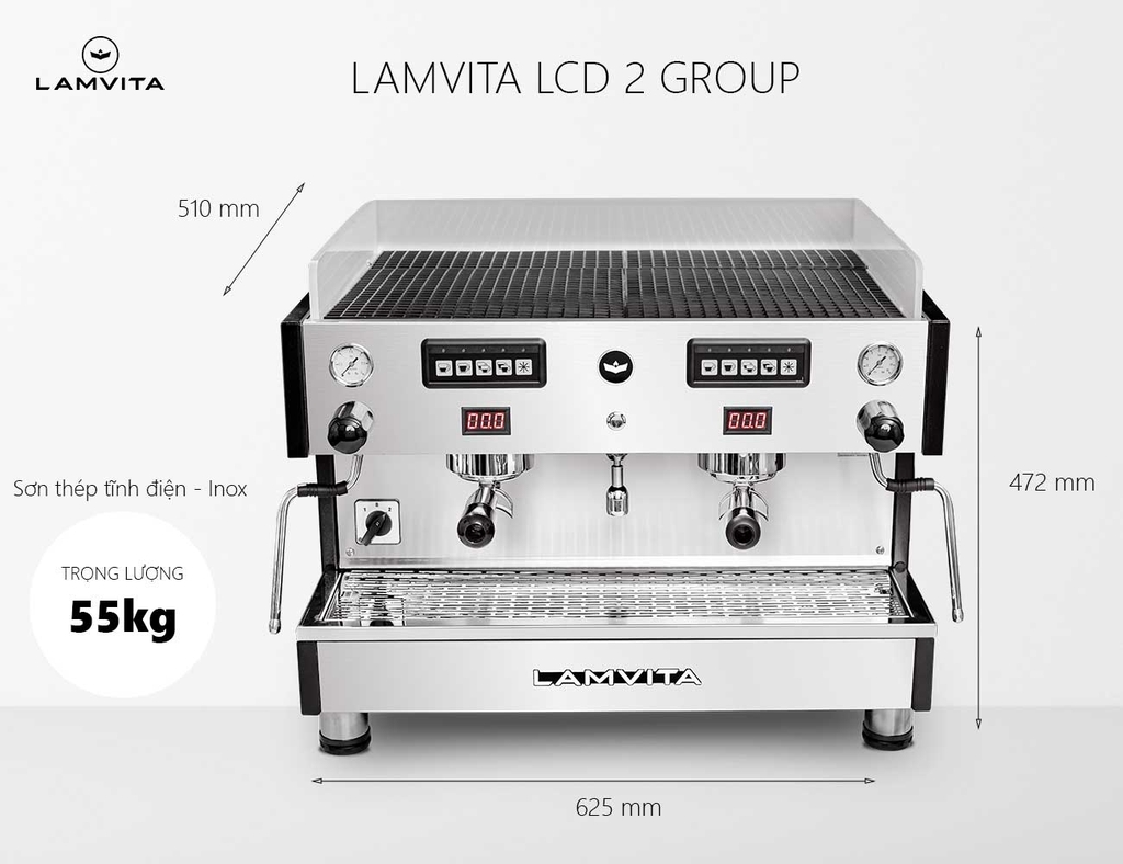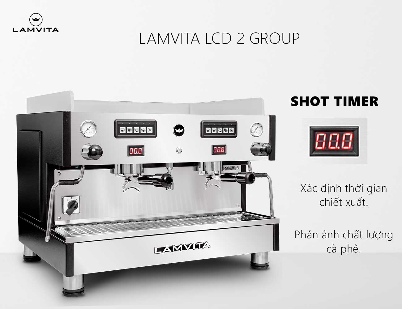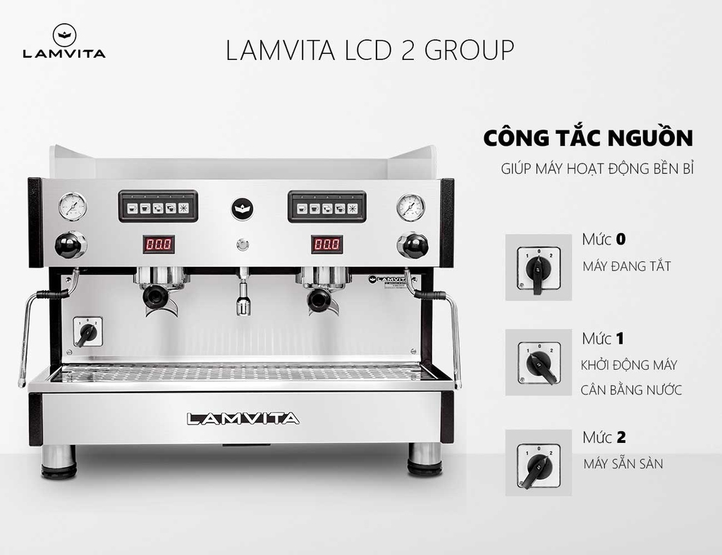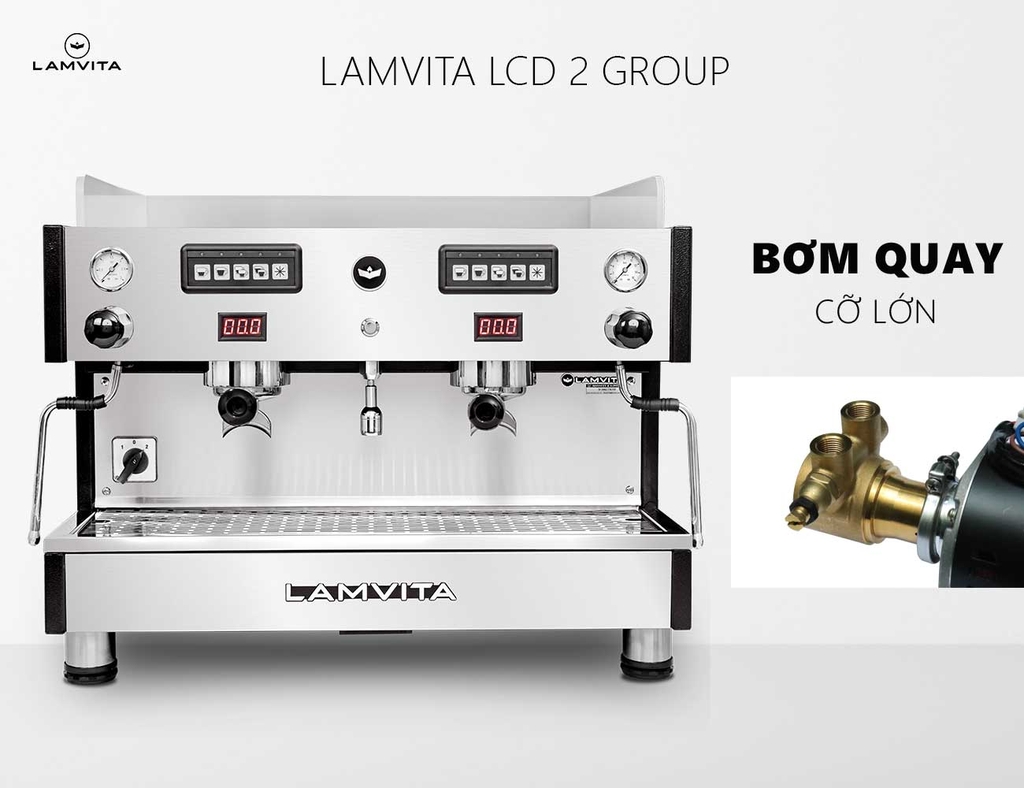 LAMVITA LCD 2 Group là dòng máy pha chuyên nghiệp, được trang bị nồi hơi (Boiler) lớn 12 lít cho áp suất hơi mạnh tạo bọt sữa mịn màng và khô. Bên trong nồi hơi lớn có bộ đun nước sôi (Heater) dài bằng nồi hơi giúp gia nhiệt nhanh tức thì và có thêm 2 nồi hơi con (Heat Exchanger) phục vụ việc pha cà phê. LAMVITA LCD 2 Group có nồi hơi lớn nên rất tiện lợi cho việc lấy nước sôi nhiều, pha trà hay pha cà phê phin.