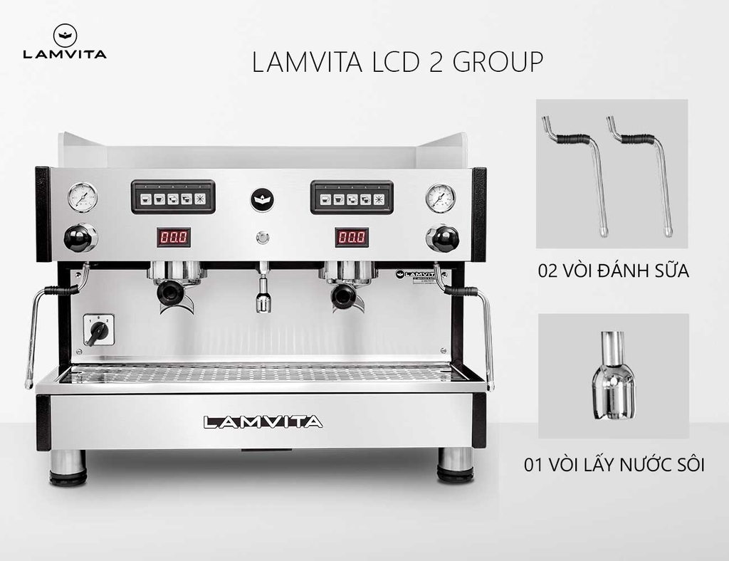 LAMVITA LSD 2 GROUP có 02 vòi đánh sữa và 01 vòi lấy nước sôi.